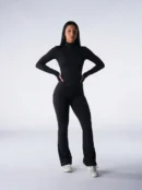 Le haut zippé à manches longues présente une ligne épurée, tandis que le legging taille haute à coupe évasée souligne la silhouette avec équilibre.
